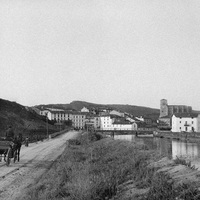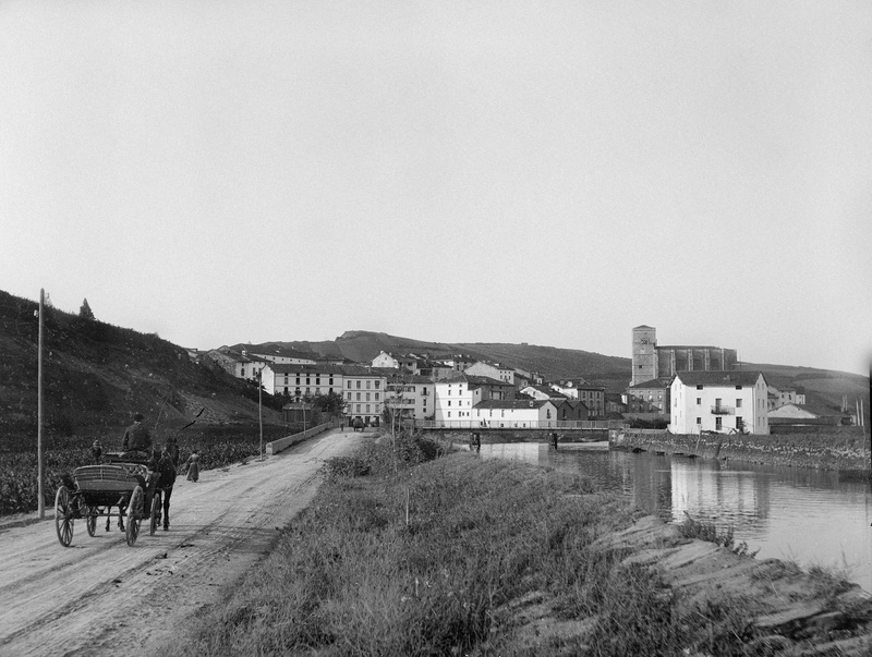 1885-1895 Vista general de Zumaia donde se aprecia uno el camino de acceso a la villa con coche de caballos, el río y al fondo la iglesia y las casas del entorno urbano.
