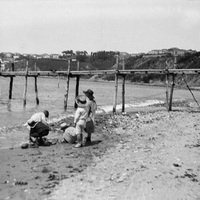 - ES 1885-1895 Vista parcial de la playa de Ereaga, en Algorta, embarcadero de postes y unos niños jugando en la orilla.