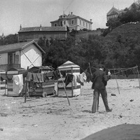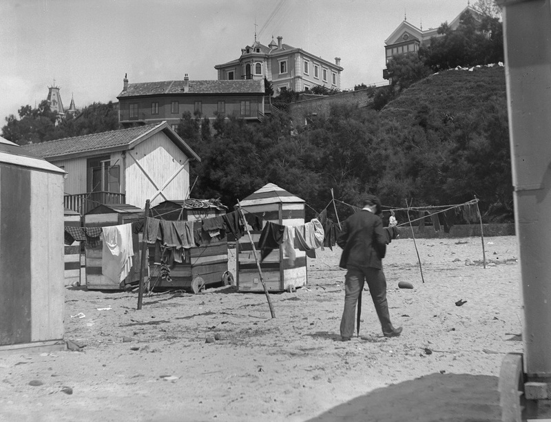 1885-1895. Vista parcial de la playa de Ereaga, Algorta, con un hombre de espalda, quizá Luis Chalbaud Errazquin y a su izquierda casetas de bañistas y una casa de playa.