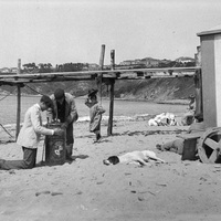 1885-1895. Escena en la playa de Ereaga, Algorta, donde aparecen Manuel Chalbaud junto a un barquillero. Tras ellos la estructura de madera del embarcadero y parte de la "Casa de Baños" de Antonio Arechabaleta.