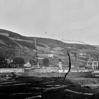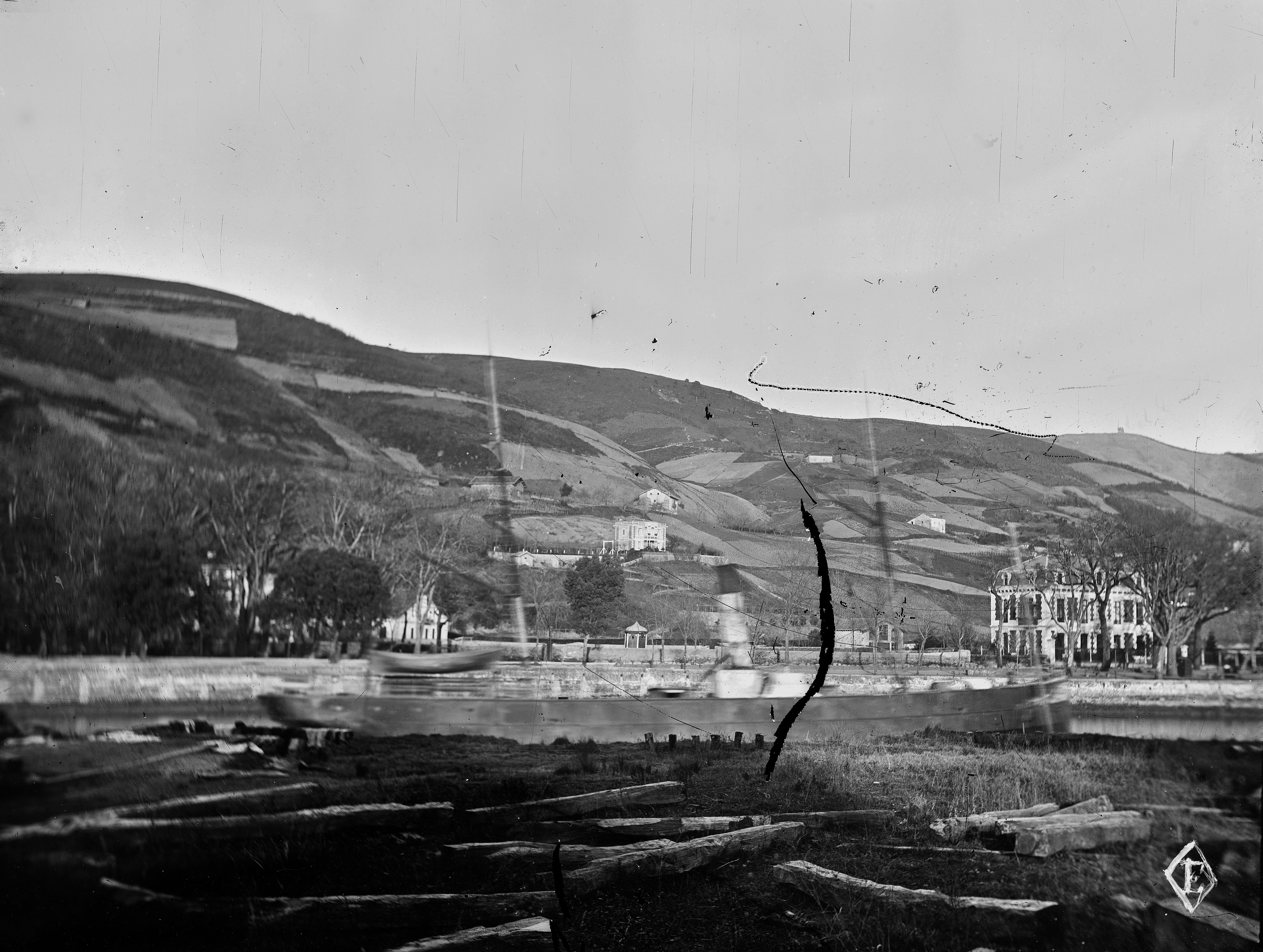 Antes de 1874 Vista tomada desde la margen izquierda mostrando el final del Campo Volantín y el paraje de La Salve. En la ría un vapor marcha hacia el centro urbano. En la margen derecha apreciamos la casa de Juan E. Delmas, destruida en el trascurso de la II Guerra Carlista, y la casa del Fielato, donde se situaba la cadena, el límite entre la Villa y la anteiglesia de Deusto.