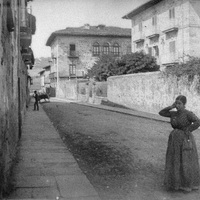 1880 - 1895 Vista parcial de la villa de Elorrio destancado en primer término la calle Urarka con el palacio Aldapebeitia al fondo, levantado por Antonio de Beitia de Aldape, nacido en Elorrio en 1648, a su derecha, la casa Esteibar-Arauna, de pricipios del siglo XVIII.