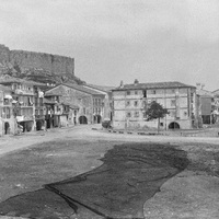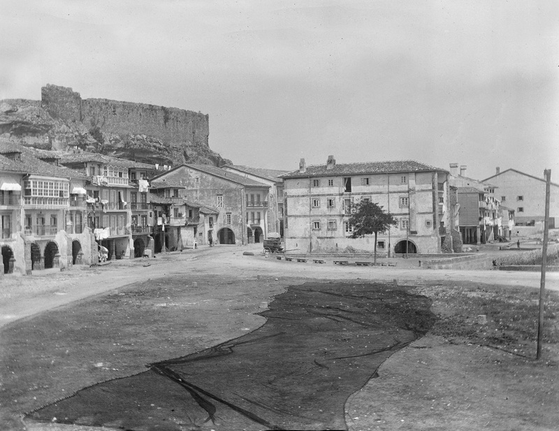 1880-1895 Vista general de la plaza de San Vicente de la Barquera con las ruinas del castillo al fondo.
