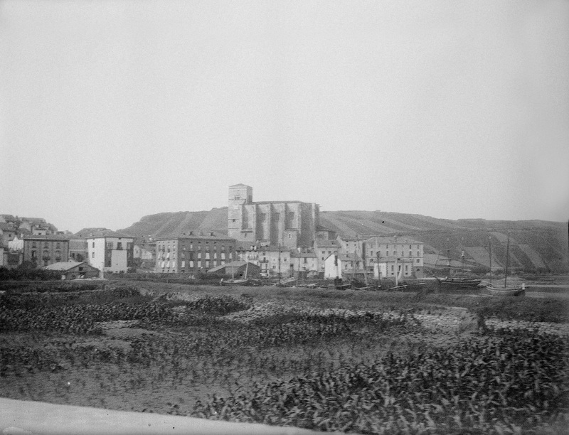 - ES 1885-1895 Vista general de Zumaia donde se aprecian los campos en torno a la villa, la parroquia de San Pedro y un velero en el puerto.