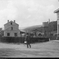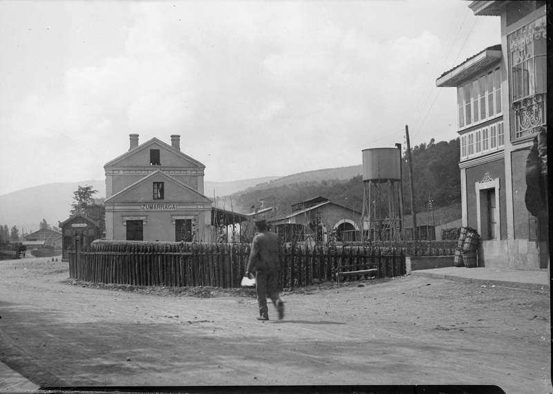 1885-1895 Vista de la estación de Zumarraga donde se aprecia un depósito de agua y la esquina del Hotel Ugalde, cuya fachada principal puede apreciarse en ERR-512