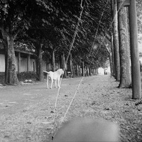 - ES 1885-1895 Vista parcial de una calle de Zumaia donde se aprecia un perro en una calle con árboles a ambos lados.