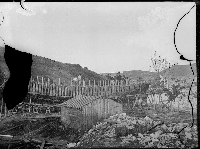 1885-1895 Vista general una carpinteria de ribera de Zumaia donde se aprecia el costillar de un barco en construcción y dos hombres trabajando.