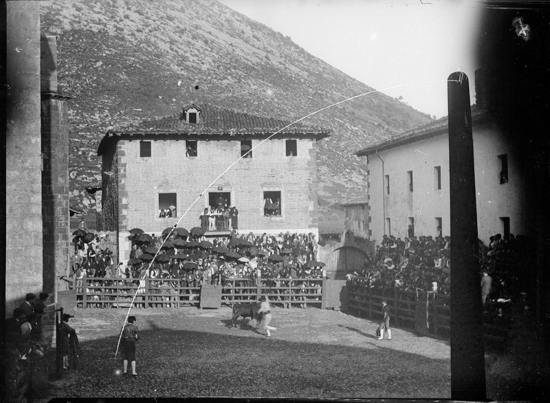 - ES 1885-1895 Vista parcial de una plaza Nagusia de Zestoa, donde se aprecia el desarrollo de una corrida de toros. Mas datos en ERR-431.