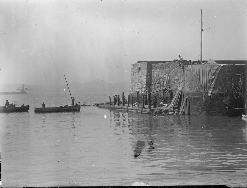 1885 - 1895 Vista parcial del puerto viejo de Algorta donde se aprecia un grupo de hombres manipulando redes y barcos en el agua. Al fondo la grua "Gran Titan", durante la construcción del muelle de Arriluze. La grua, ver ERR-446. Esta imagen ha sido reproducida en el calendario 2020, en el mes de diciembre, editado por la Autoridad Portuaria de Bilbao /Bilboko Portuko Agintaritza en colaboración con el Museo.