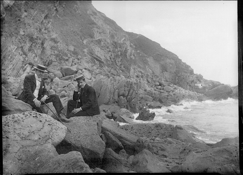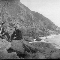 Escena donde aparecen dos hombres sentados entre las rocas de la costa de Algorta. Uno de ellos pudiera ser Manuel Chalbaud Errazquin.