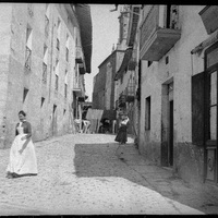 - ES c. 1891 Vista de una calle de Getaria con una mujer vestida a la usanza de las criadas.