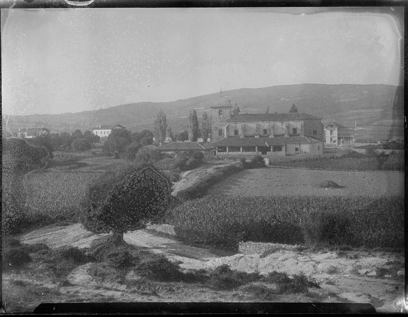 - ES 1885-1895. Vista general de Zumarraga con el camino en primer termino y la iglesia en el centro de la imagen.