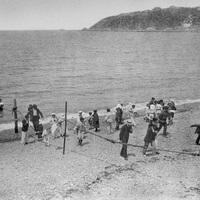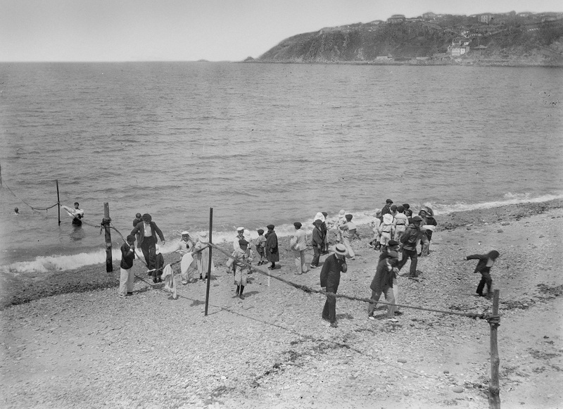 - ES 1891. Escena en la playa de Ereaga, Algorta, donde aparecen hombres y niños en la orilla. Al fondo el puerto viejo.