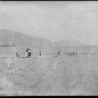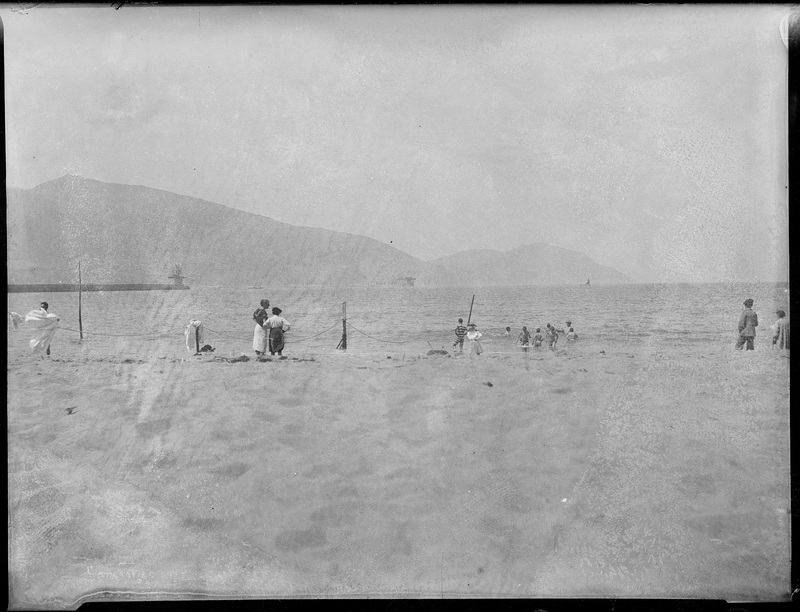 1890-1895. Escena en la playa de Ereaga, Algorta, donde aparecen niños en la orilla y bañándose. Al fondo la grua "Gran Titan", durante la construcción del muelle de Arriluze.