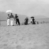 - ES 1890-1895. Escena en la playa de Ereaga, Algorta, donde aparecen, sirvientas con sombrilla, niños en la orilla y bañándose.
