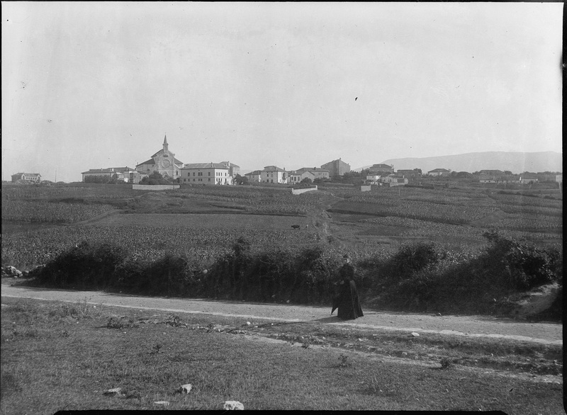 1890-1895 Vista general de Algorta donde se ve en primer término el camino a La Galea y al fondo el perfil de la iglesia de los Trinitarios (detalle v. ERR-458).