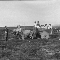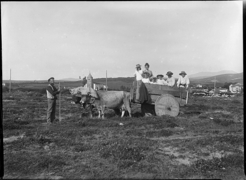1890-1895. Escena campestre donde aparece en primer término un lugareño con el carro de bueyes trasportando a un grupo de niños con la criada. Tras ellos Andra Mari de Getxo.