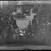 Escena que, tomada desde uno de los balcones de la casa Errazquin, nos muestra la plazuela de Santiago con el carruaje de la visita real trasportando a Mª Cristina, las infantas y el principe y el público rodeándolos.