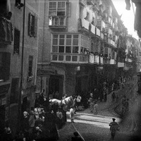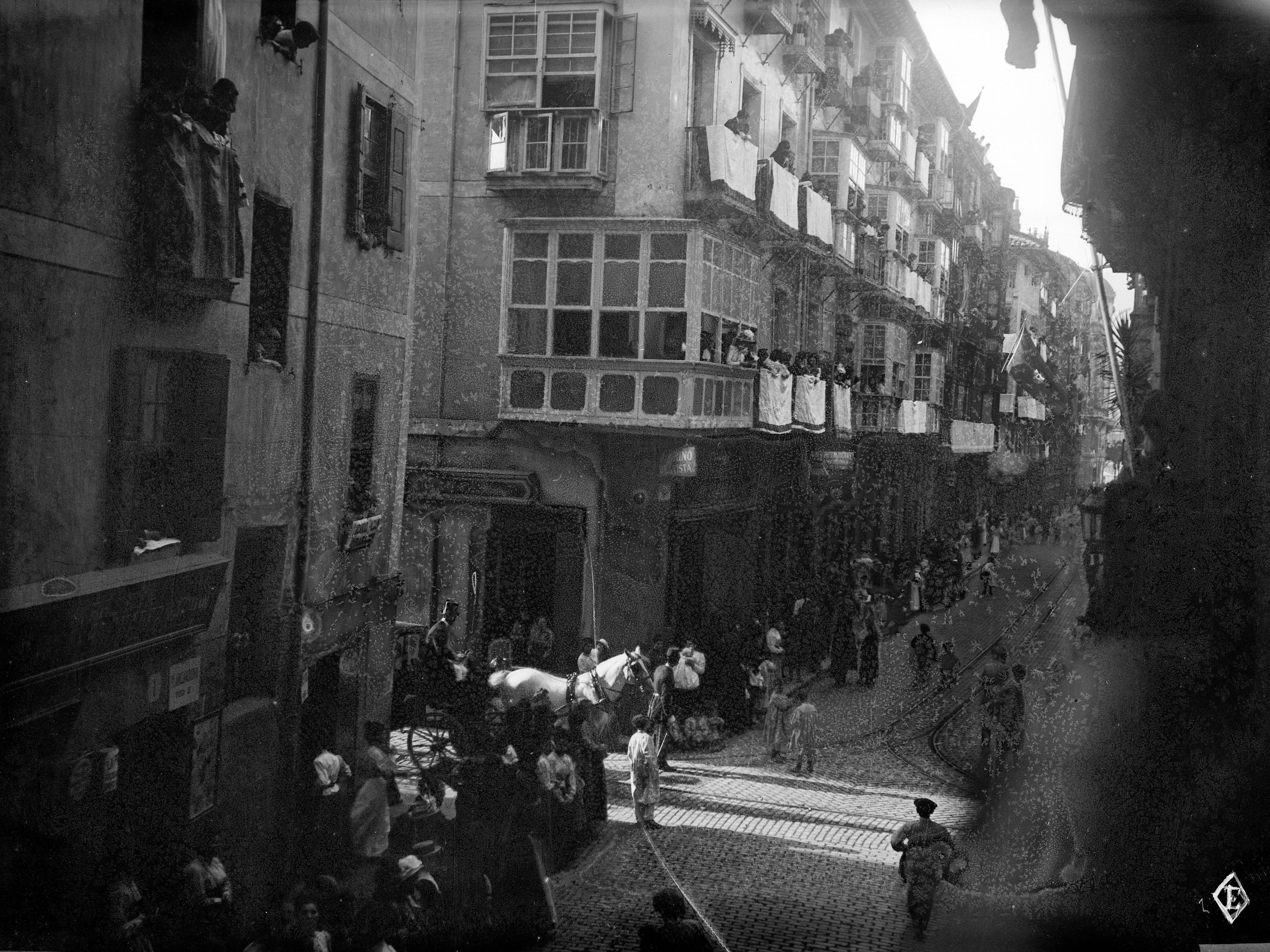 1887 Las viviendas de la calle Bidebarrieta, entre las que se encuentra en primer término la casa natal del almirante José de Mazarredo, se hallan engalanadas con colgaduras debido a la visita de la regente Mª Cristina y su hijo Alfonso XIII. La vista parece estar tomada desde uno de los balcones de la residencia de Pedro Telesforo de Errazquin, con portal en la calle Lotería, este magífico edificio, que hoy pervive, se comenzó a construir en 1851 y se conocía como "Casa Errazquin". La imagen nos muestra la esquina con la calle El Perro, donde aparece un carruaje de caballos blancos.