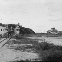- ES 1880-1895 Vista del puerto de Sokoa con la torre del fuerte recortando el cielo.
