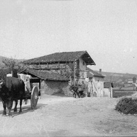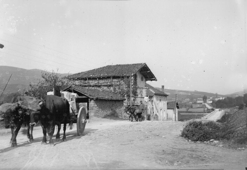 - ES 1880 - 1895 Vista general donde aparece un camino transitado por un carro de bueyes y caserios a un lado.
