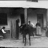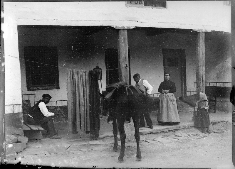 1885 - 1895 Escena rural donde aparece el portal de un caserio sin identificar con varios personajes en el. Rótulo incompleto en el caserío con "POR"