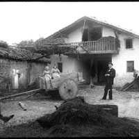 1885 - 1895 Escena rural donde parece la fachada principal de un caserio, sin identificar, con su balcon y parra, delante, un carro con dos niñas dentro y a la derecha un hombre vestido a la usanza urbana.