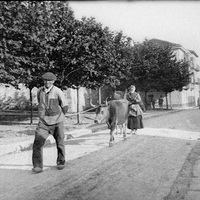 1880 - 1895 Escena rural sin identificar donde parecen una pareja de campesinos con su vaca circulando por un camino, arbolado y casas.