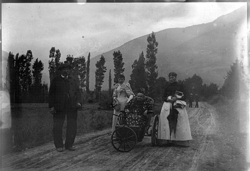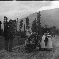Retro de un hombre tirando de un carro donde va una anciana y a ambos lados dos señoras, en camino. Sin identificar. Semejante ver ERR-479