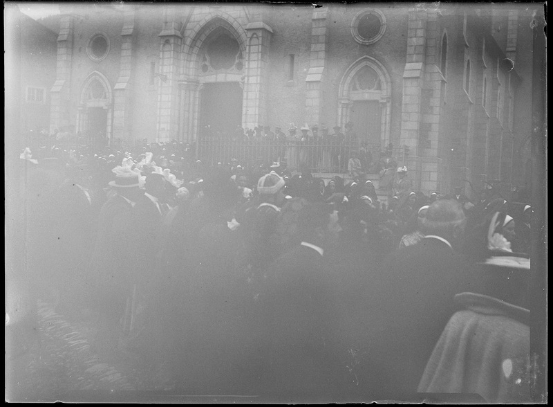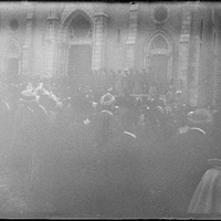- ES 1880-1895 Desfile, procesión, acontecimiento delante de una iglesia, sin identificar. Muy parecida a Santa Eugenia de Biarritz.