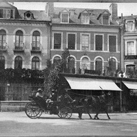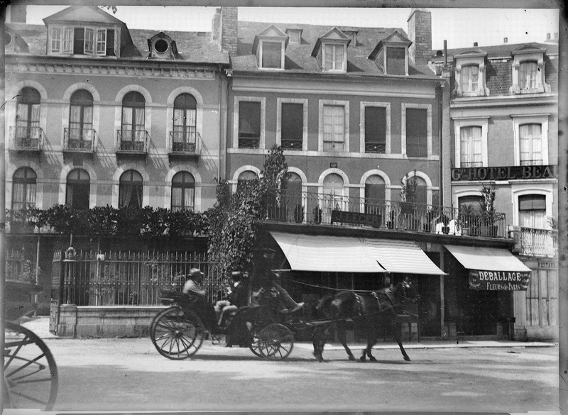 1880-1895 Paisaje urbano frances con hotel (HOTEL BEAU...), y un comercio que en la visera del toldo se lee "DEBALLAGE / FLEURS DE PARIS", sin identificar.