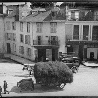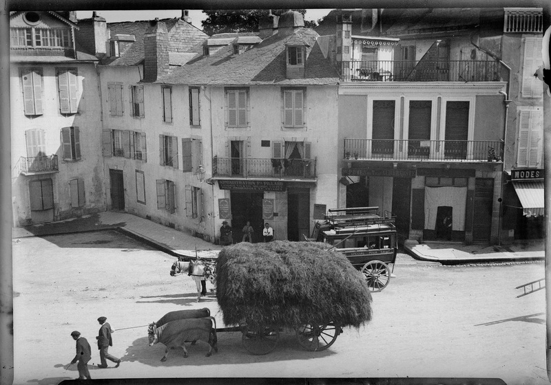 Paisaje urbano frances donde una casa tiene cartel donde se lee "ADMINISTRATION F. PILLARD LANDAUS VIS A VIS MILORDS COUPES POUR PROMENADES ET VOYAGES", sin identificar.