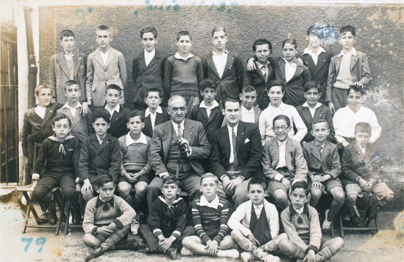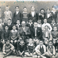 Excursión de los alumnos de la Escuela y biblioteca del Emigrante, fundación Ostolaza, de Deva, en viaje de estudios a la muy ejemplar ciudad de Eibar, acompañados del profesor, D. Julián González de García, y el filántropo D. José Manuel Ostoiaza (Foto Ojanguren.) Pie de foto en El Liberal de 5 de Julio de 1933